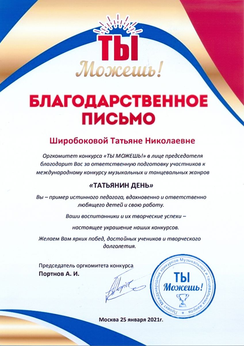 Международный проект музыкальных и танцевальных жанров "Ты можешь" конкурса "Татьянин день" - Широбокова Т.Н. - Благодарственное письмо