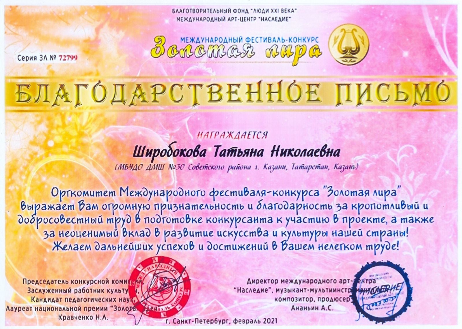 Международный фестиваль-конкурс "Золотая лира" - Широбокова Т.Н. - Благодарственное письмо