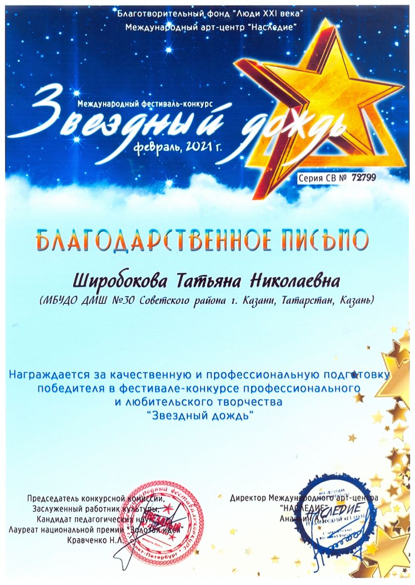 Международный фестиваль-конкурс "Звездный дождь" - Широбокова Т.Н - Благодарственное письмо