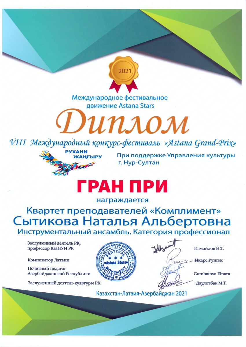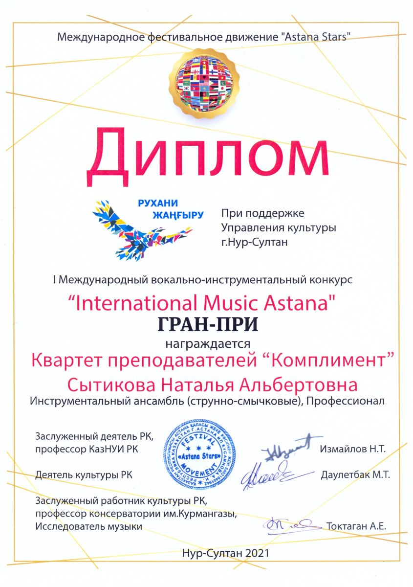 I Международный вокально-инструментальный конкурс "International Music Astana" - Сытикова Н.А.  в составе квартета преподавателей "Комплимент" - Гран-при