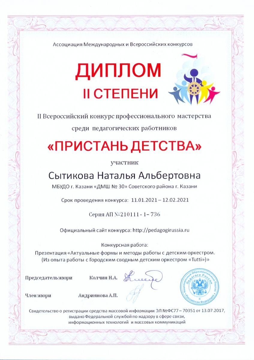 II Всероссийский конкурс профессионального мастерства среди педагогических работников "Пристань детства" - Сытикова Н.А. - диплом II степени