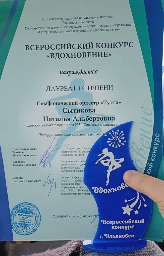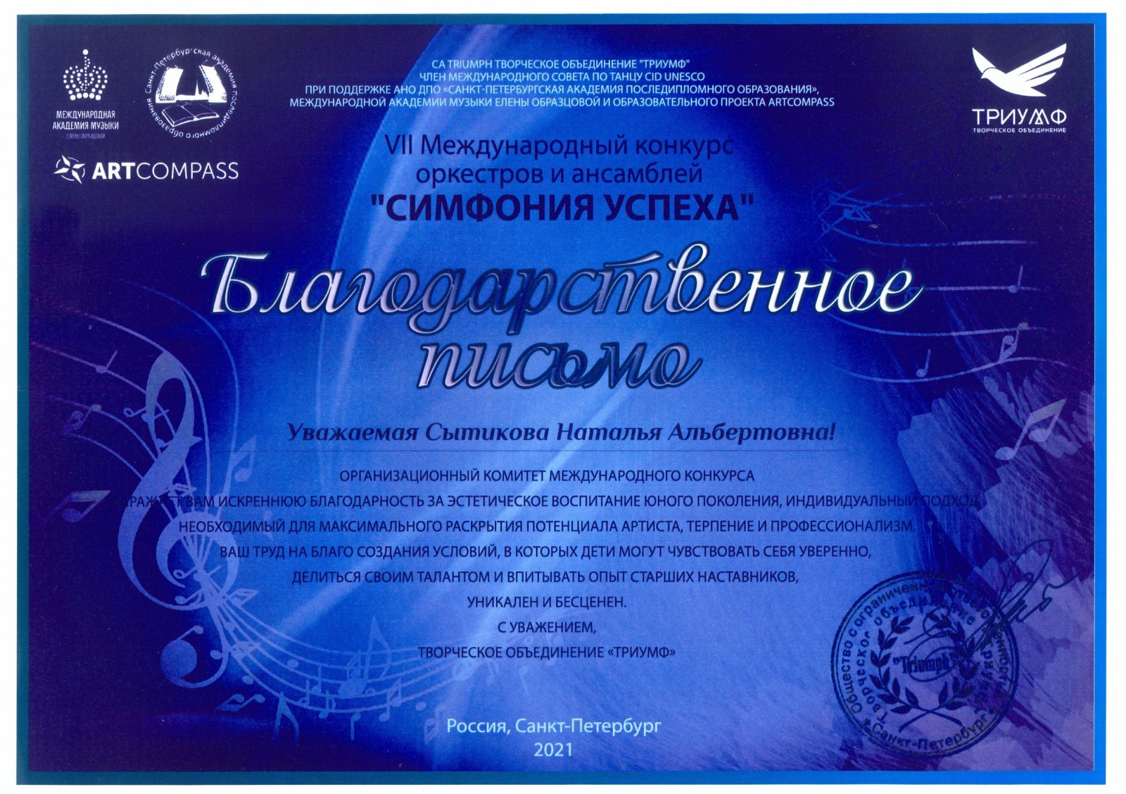 VII Междунарожный конкурс оркестров и ансамблей "Симфония успеха" - Сытикова Н.А. - Благодарственное письмо