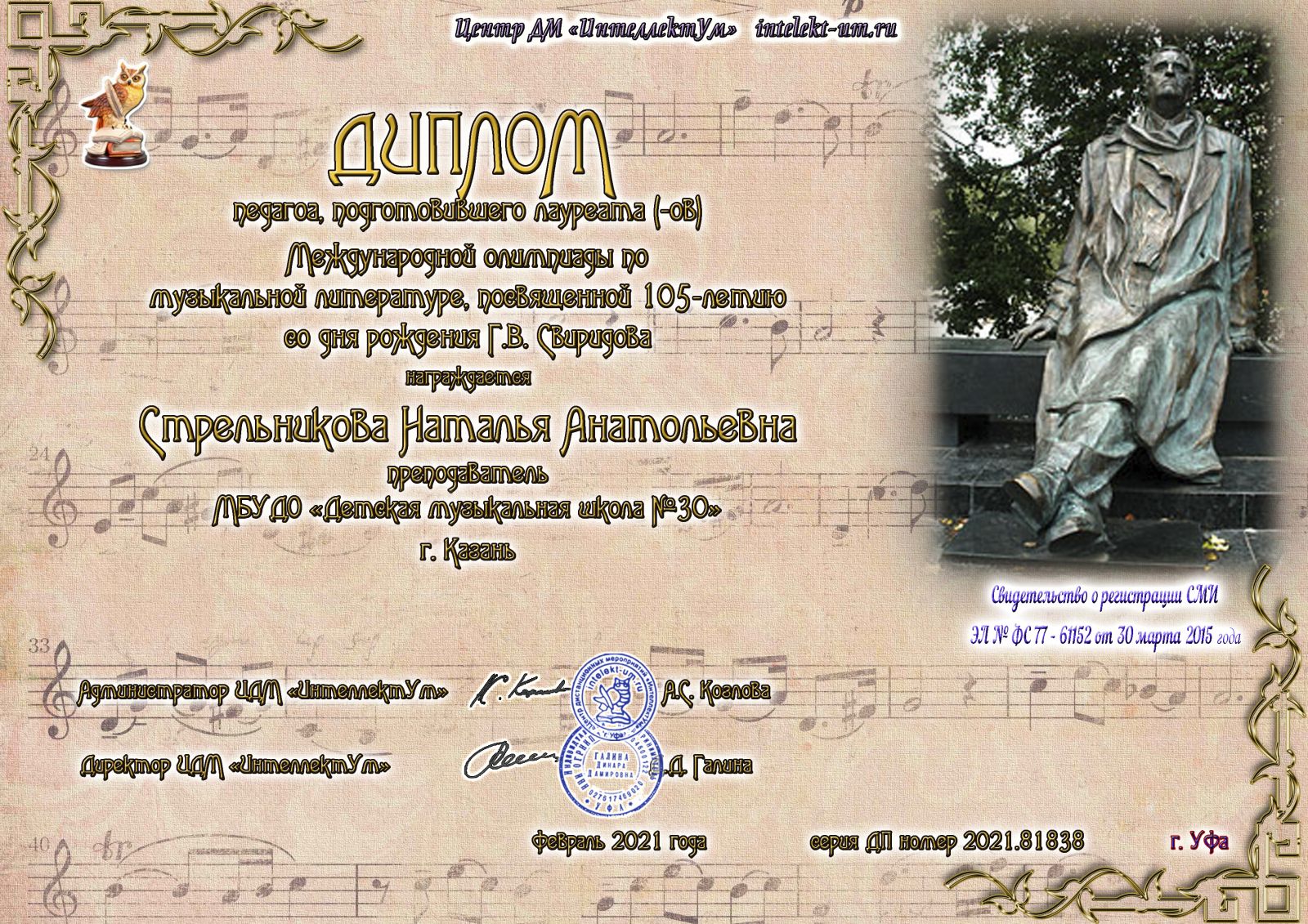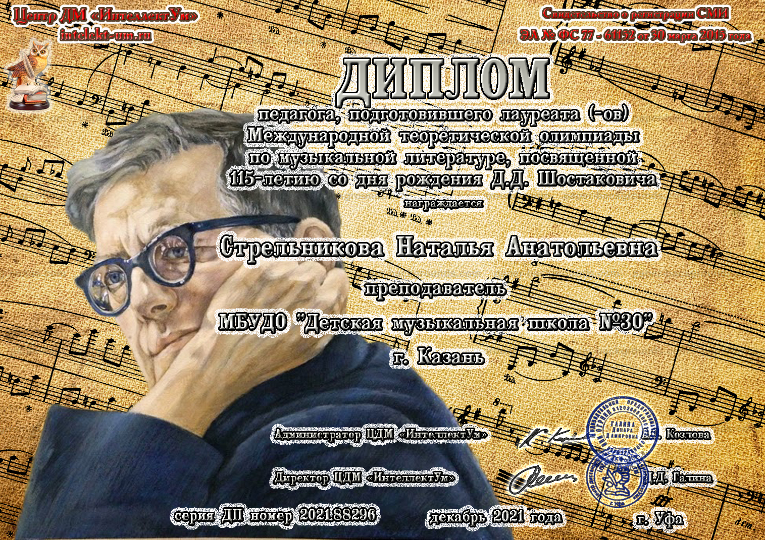 Международная теоретическая олимпиада по музыкальной литературе, посвященной 115-летию со дня рождения Д.Д.Шостаковича - Стрельникова Н.А. - диплом