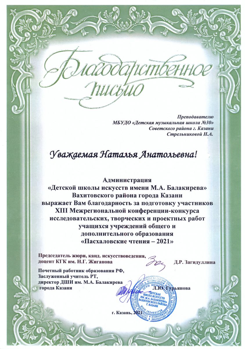 XIII Межрегиональная конференция-конкурс исследовательских, творческих и проектных работ учащихся учреждений общего и дополнительного образования "Пасхаловские чтения-2021" - Стрельникова Н.А. - Благодарственное письмо
