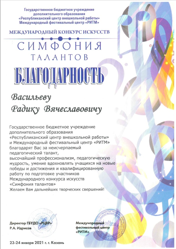 Международный конкурс искусств "Симфония талантов" - Васильев Р.В. - Благодарность