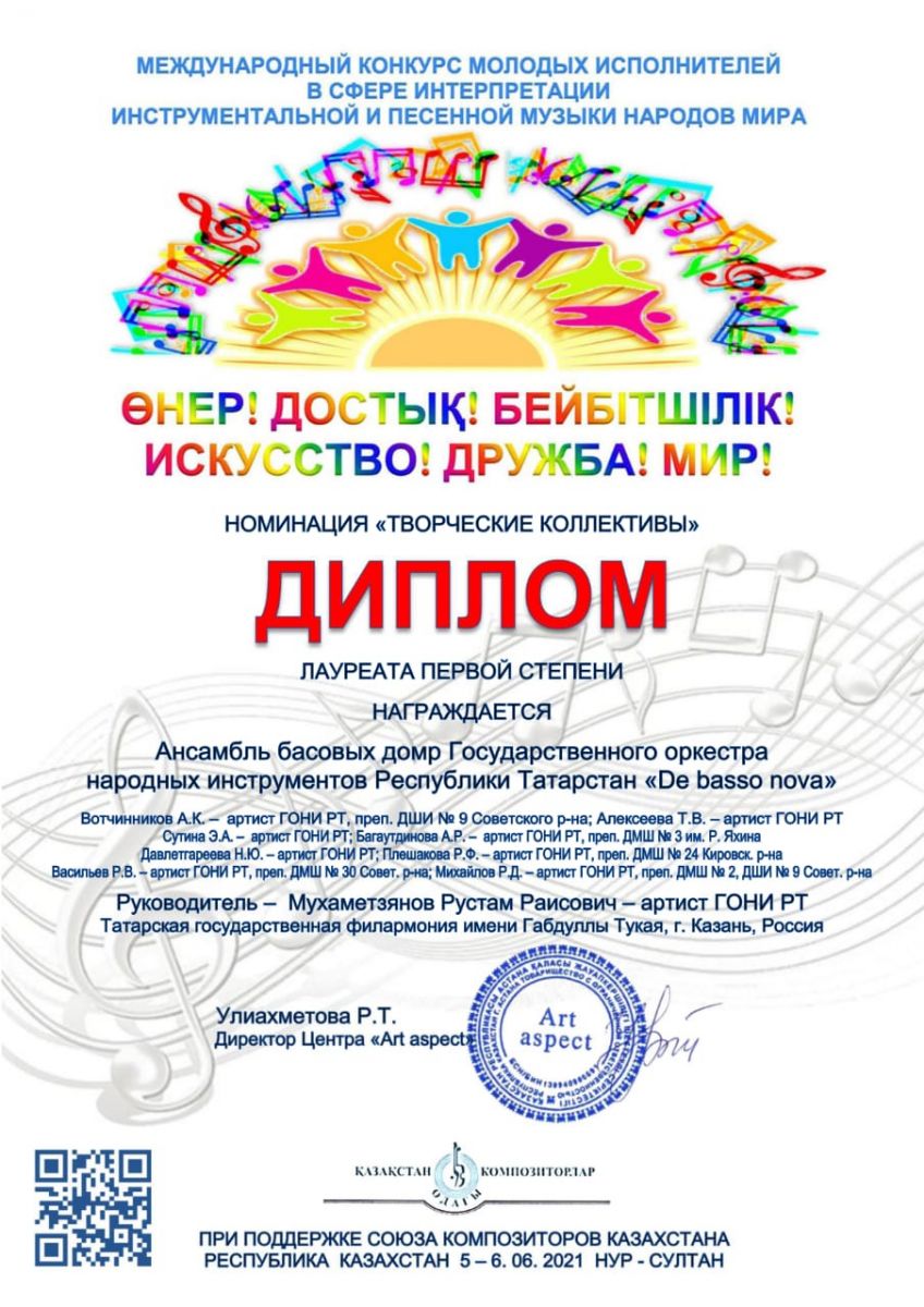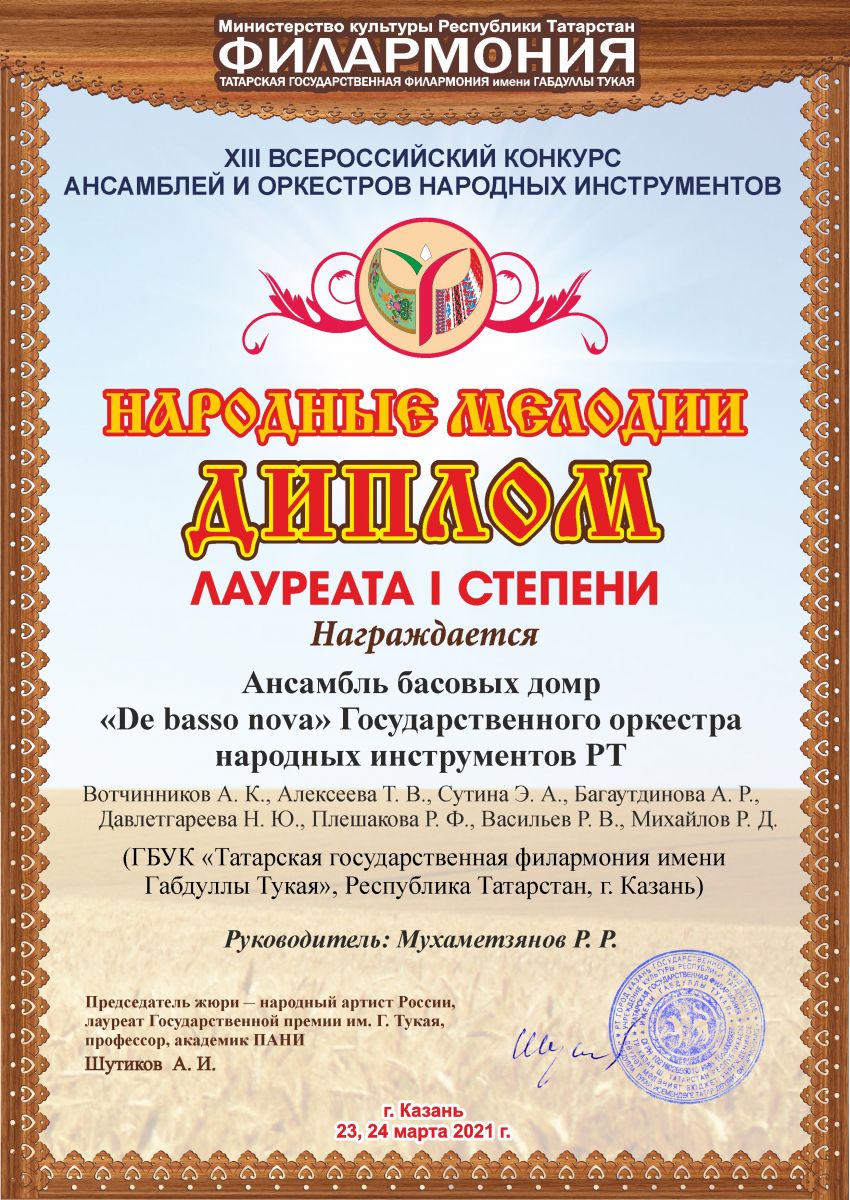 Международный конкурс молодых исполнителей в сфере интерпретации инструментальной и песенной музыки народов мира - ансамбль басовых домр Государственного оркестра народных инструментов РТ "De basso nova" в составе Р.В. Васильева - I место