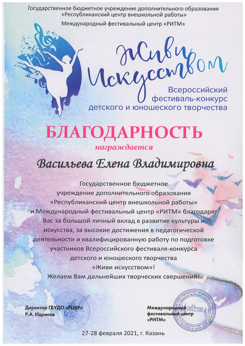 Всероссийский фестиваль-конкурс детского и юношеского творчества "Живи искусством" - Васильева Е.В. - Благодарность
