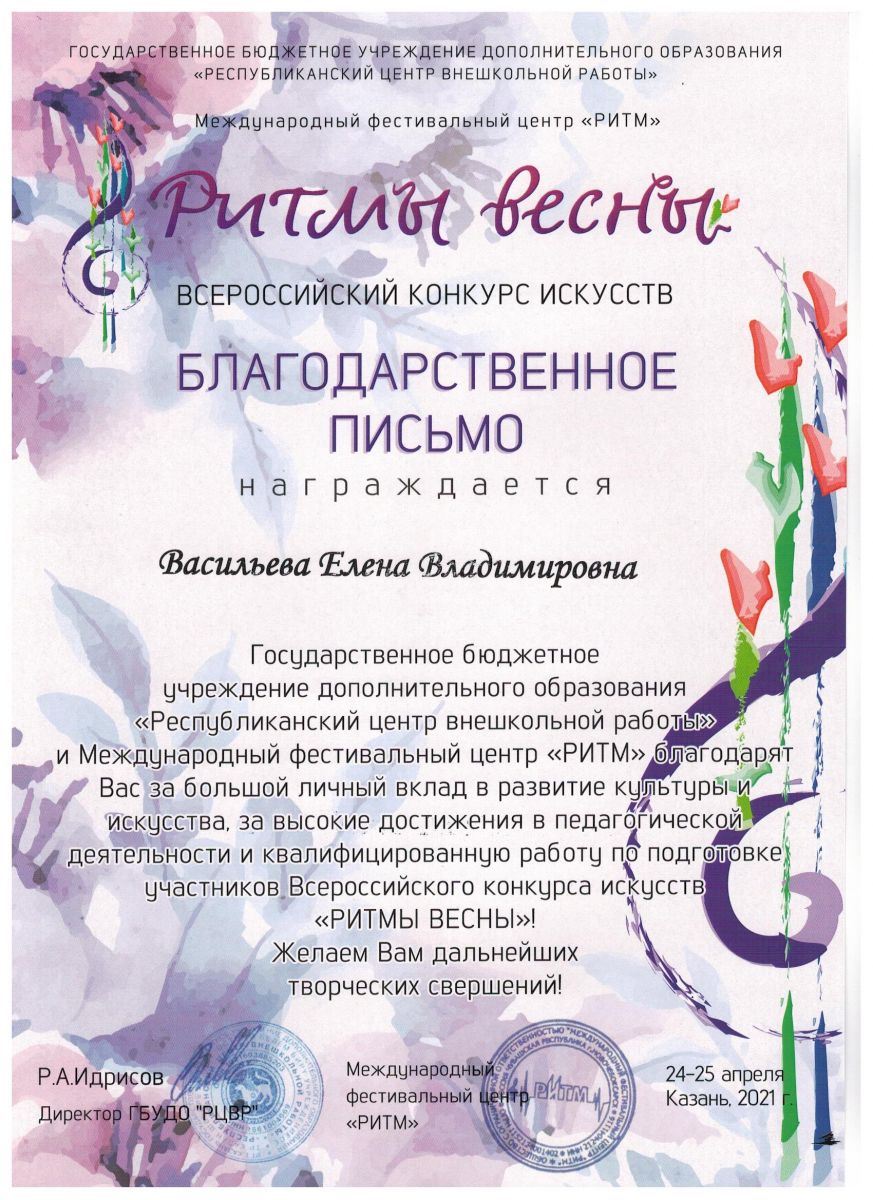 Всероссийский конкурс искусств "Ритмы весны" - Васильева Е.В. - Благодарственное письмо