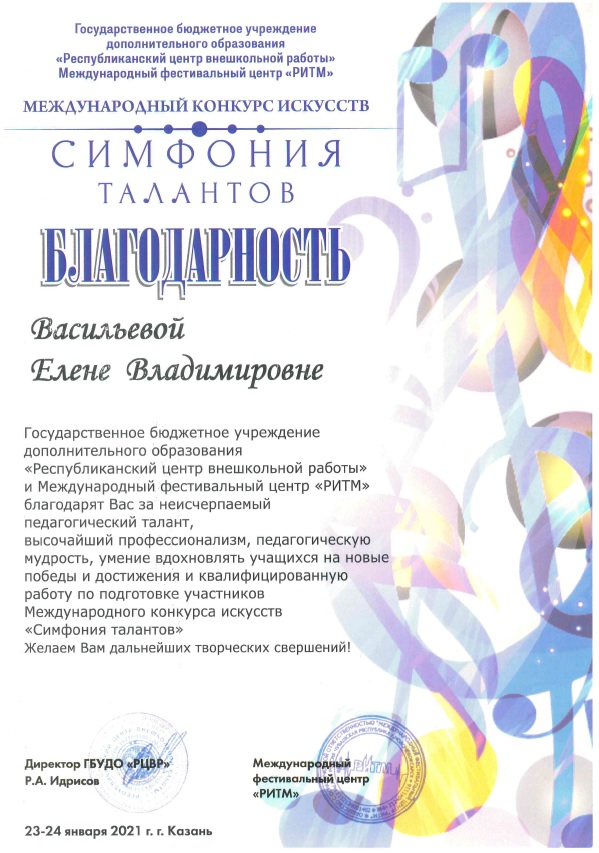 Международный конкурс искусств "Симфония талантов" - Васильева Е.В. - Благодарность