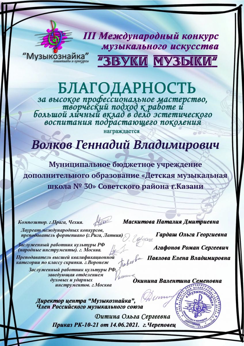 III Меджународный конкурс музыкального искусства "Звуки музыки" - Волков Г.В. - Благодарственное письмо