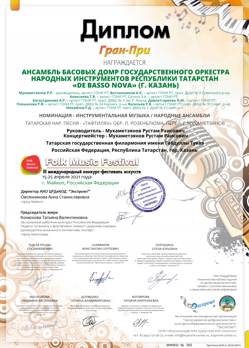 III Международный конкурс-фестиваль искусств (г.Майкоп) - ансамбль басовых домр государственного оркестра народных инструментов РТ "De basso nova" (в составе Васильев Р.В.) - Гран-При