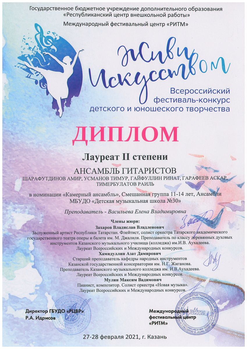 Всероссийский фестиваль-конкурс детского и юношеского творчества "Живи искусством" - ансамбль гитаристов - II место