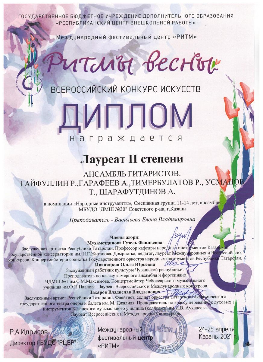 Всероссийский конкурс искусств "Ритмы весны" - ансамбль гитаристов - II место