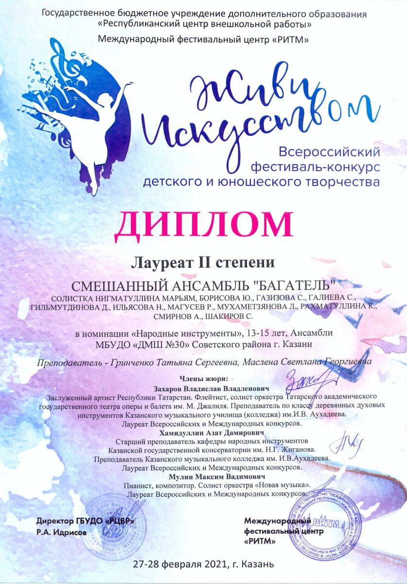 Всероссийский фестиваль-конкурс детского и юношеского творчества "Живи искусством" - смешанный ансамбль "Багатель" - II место