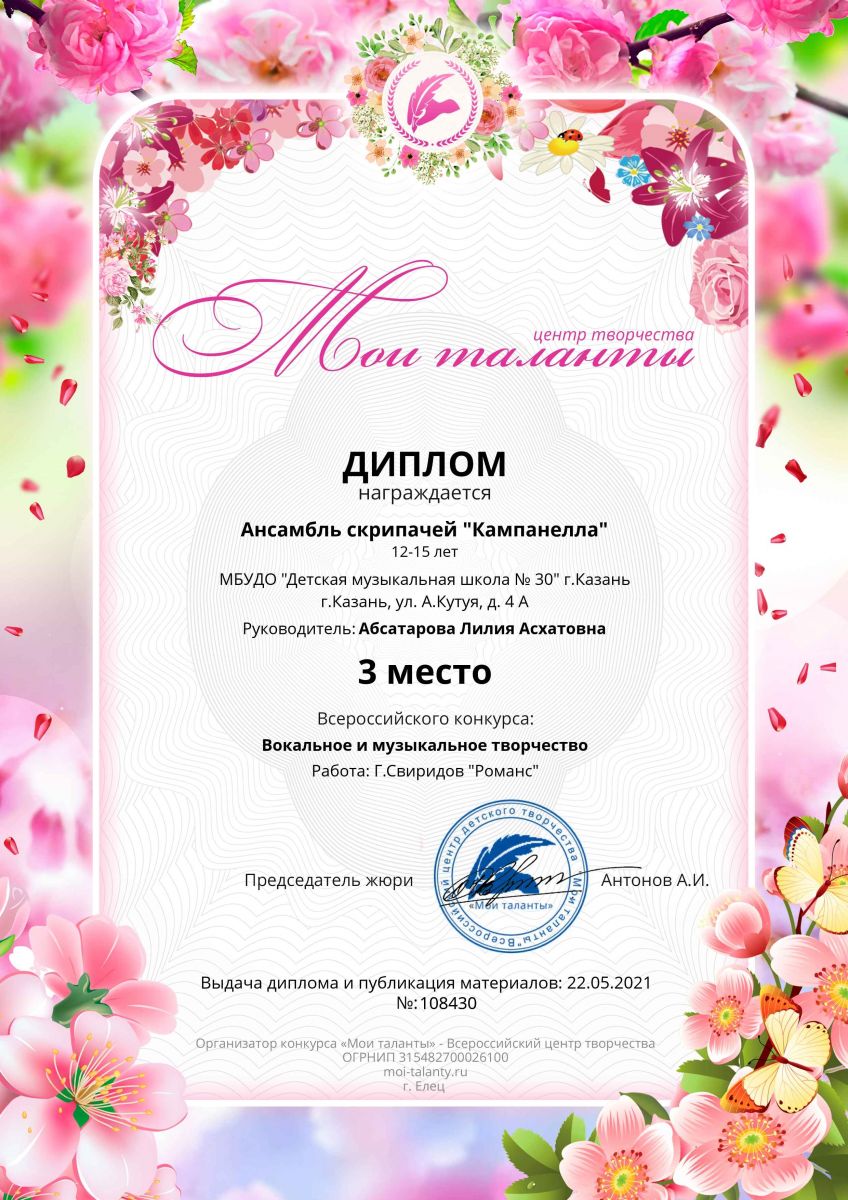 Всероссийский конкурс вокального и музыкального творчества "Мои таланты" - ансамбль скрипачей "Кампанелла" - III место