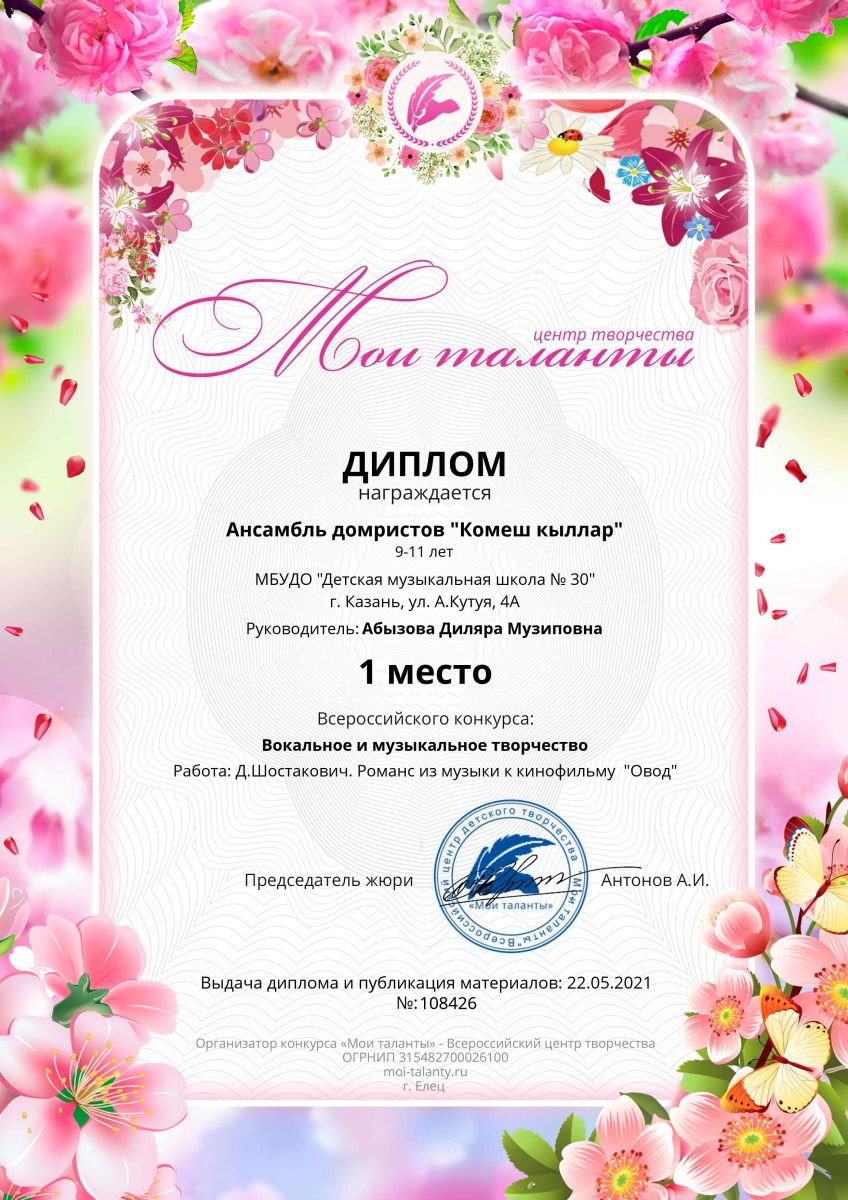 Всероссийский конкурс вокального и музыкального творчества "Мои таланты" - ансамбль "Комеш кыллар" - I место
