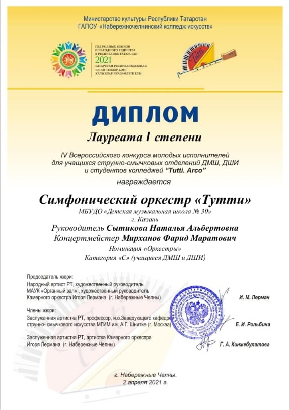 IV Всероссийский конкурс молодых исполнителей для учащихся струнно-смычковых отделений ДМШ и ДШИ и студентов колледжей "Tutti Arco" - симфонический оркестр "Тутти" - I место