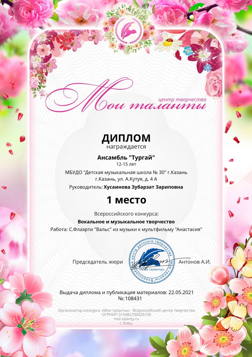 Всероссийский конкурс вокального и музыкального творчества "Мои таланты" - ансамбль "Тургай" - I место