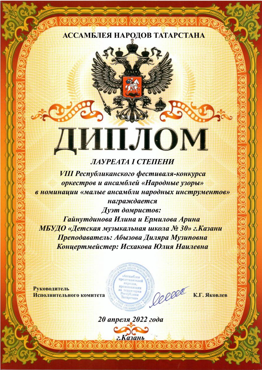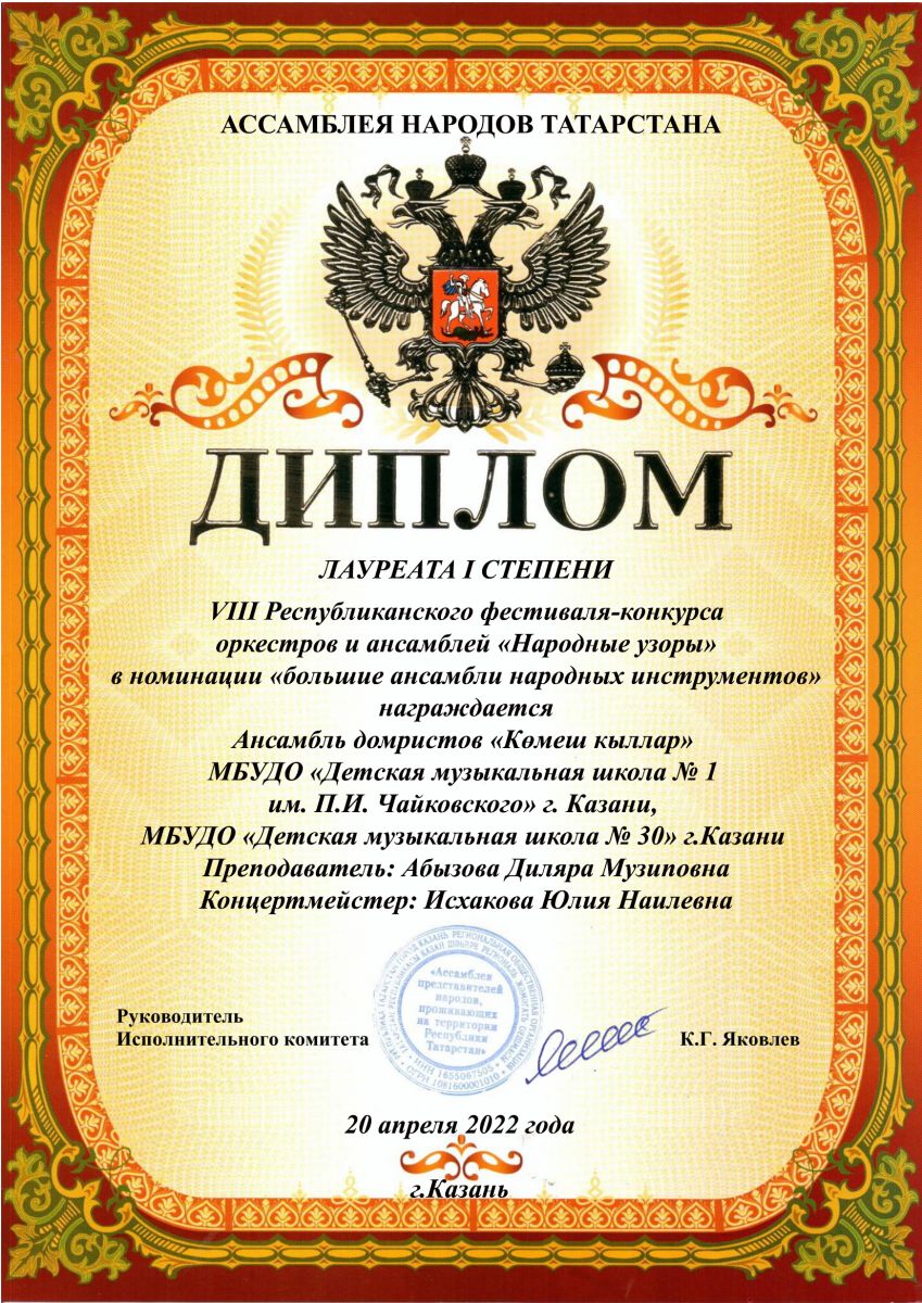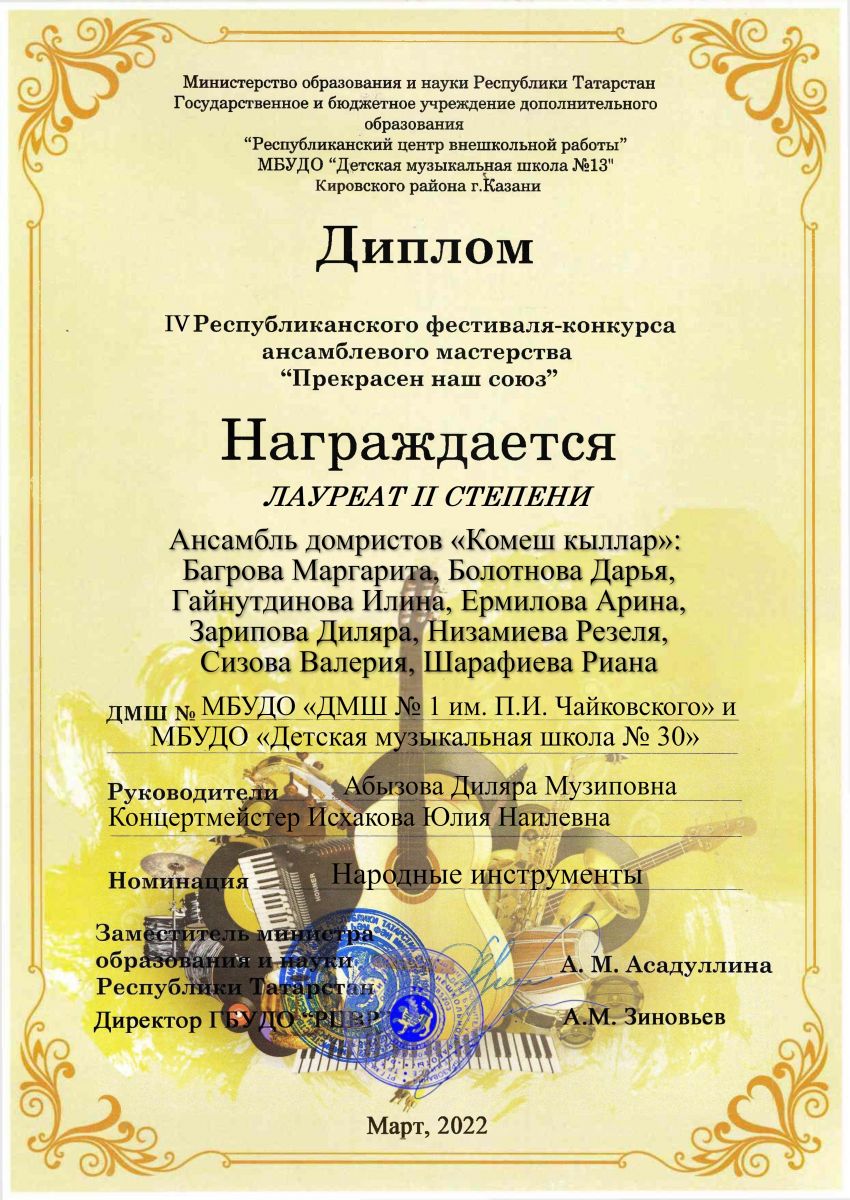 I Республиканский фестиваль "Радуга в ладонях" - ансамбль домристов "Комеш кыллар" - диплом