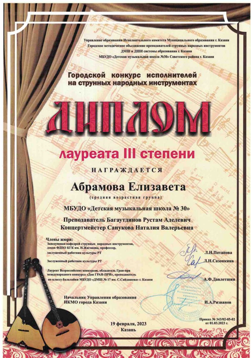 Городской конкурс исполнителей на струнных народных инструментах  (ДМШ № 30) - Абрамова Елизавета - III место