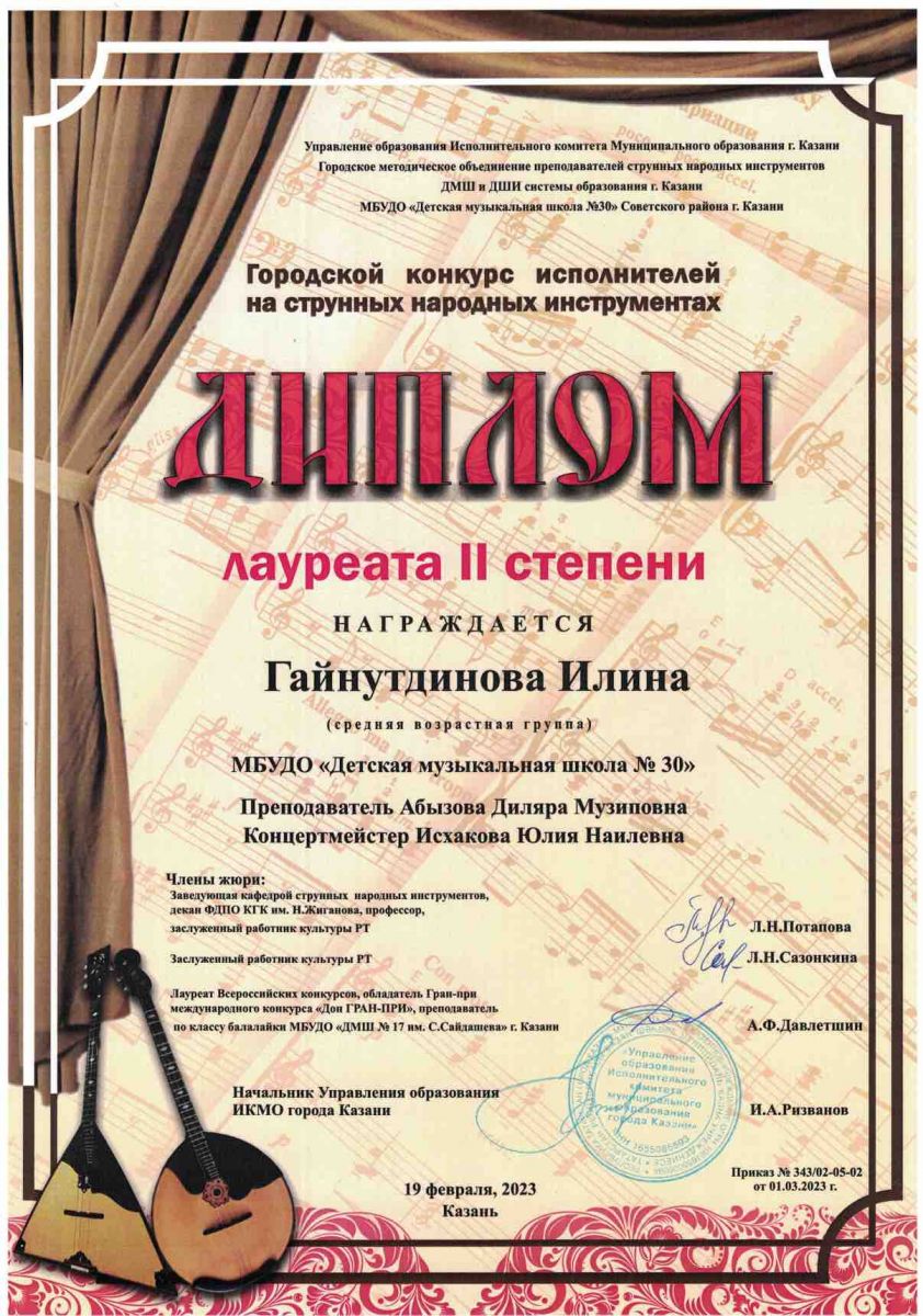 Городской конкурс исполнителей на струнных народных инструментах  (ДМШ № 30) - Гайнутдинова Илина - II место