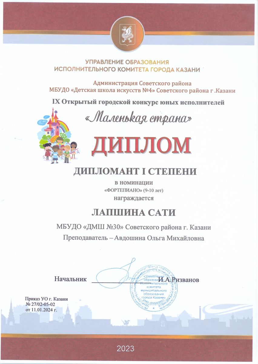 IX Открытый городской конкурс юных исполнителей "Маленькая страна" - Лапшина Сати - диплом I степени