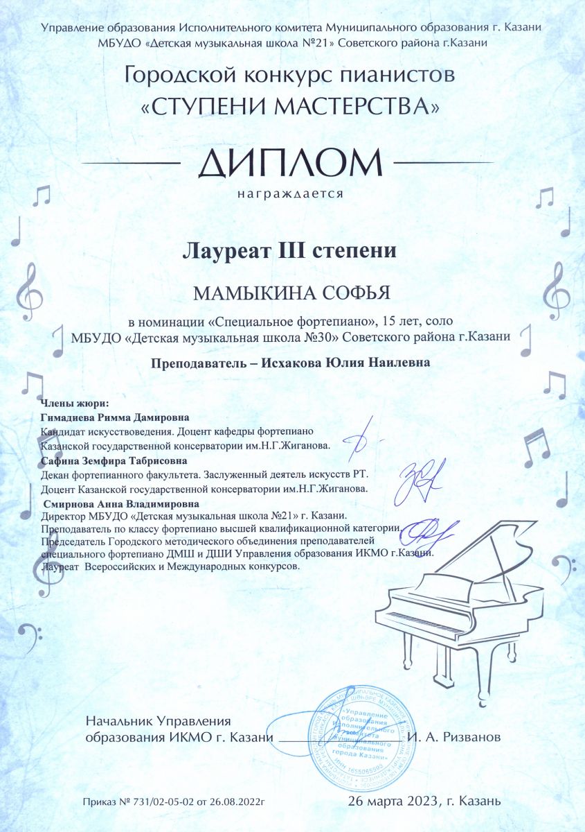 Городской конкурс пианистов "Ступени мастерства" - Мамыкина Софья - III место