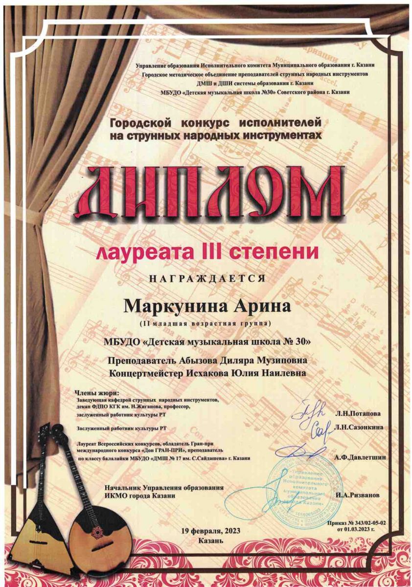 Городской конкурс исполнителей на струнных народных инструментах  (ДМШ № 30) - Маркунина Арина - III место