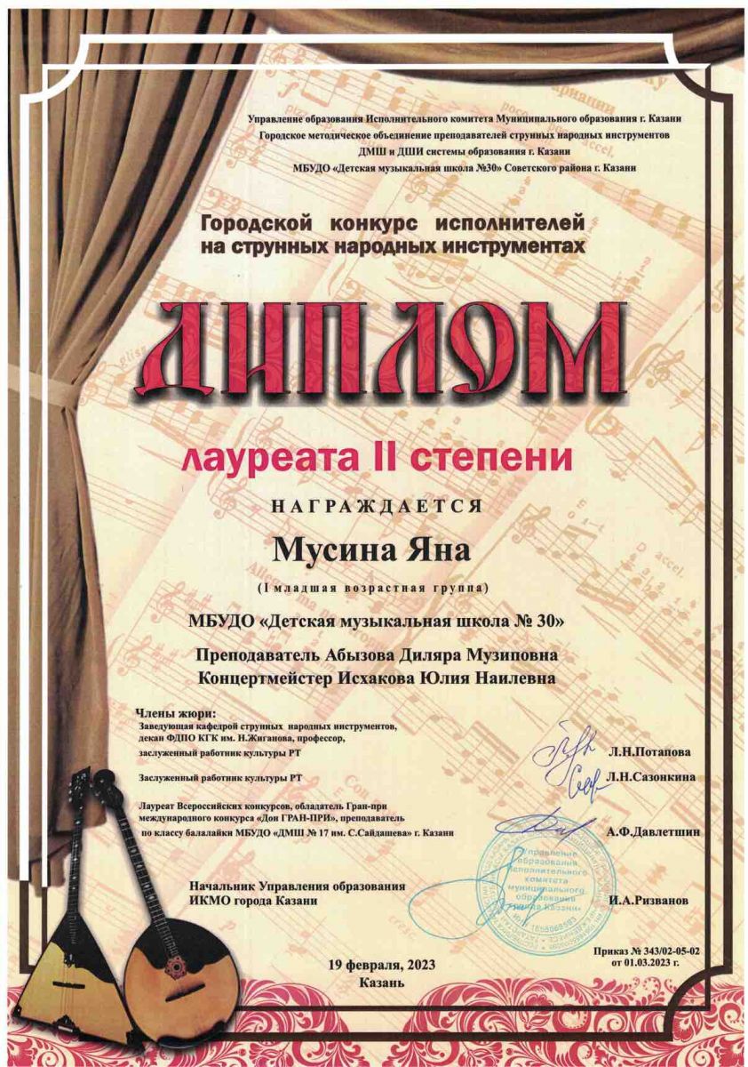 Городской конкурс исполнителей на струнных народных инструментах  (ДМШ № 30) - Мусина Яна - II место