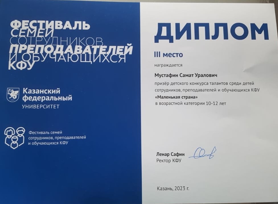 Городской фестиваль семей сотрудников преподавателей и обучающихся КФУ "Маленькая страна" - Мустафин Самат - III место