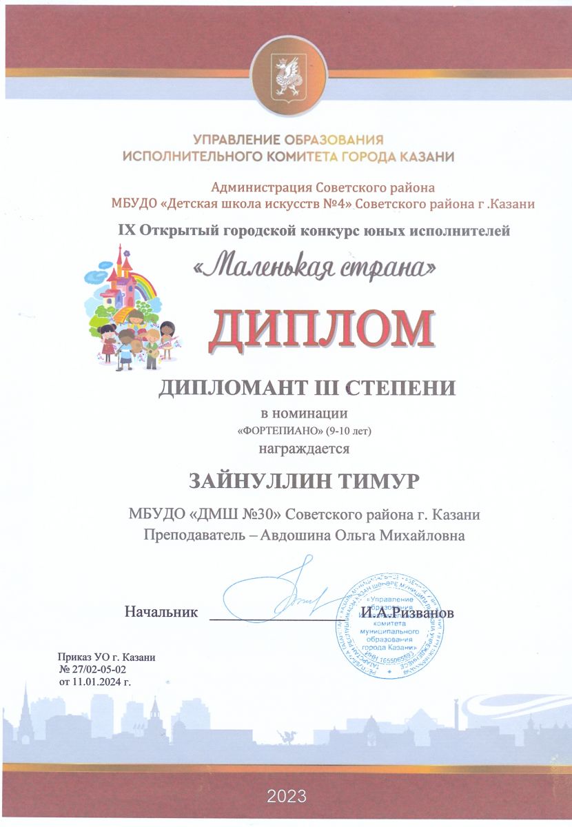IX Открытый городской конкурс юных исполнителей "Маленькая страна" - Зайнуллин Тимур - диплом III степени
