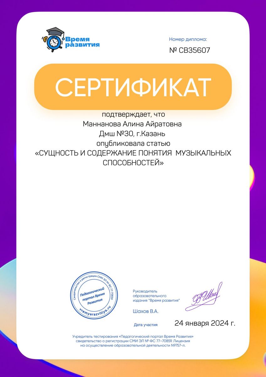 IV Открытый межрегиональный конкурс исполнителей на домре и балалайке "Туган як" - Абызова Д.М. - сертификат участника мастер-класса А.В.Белова