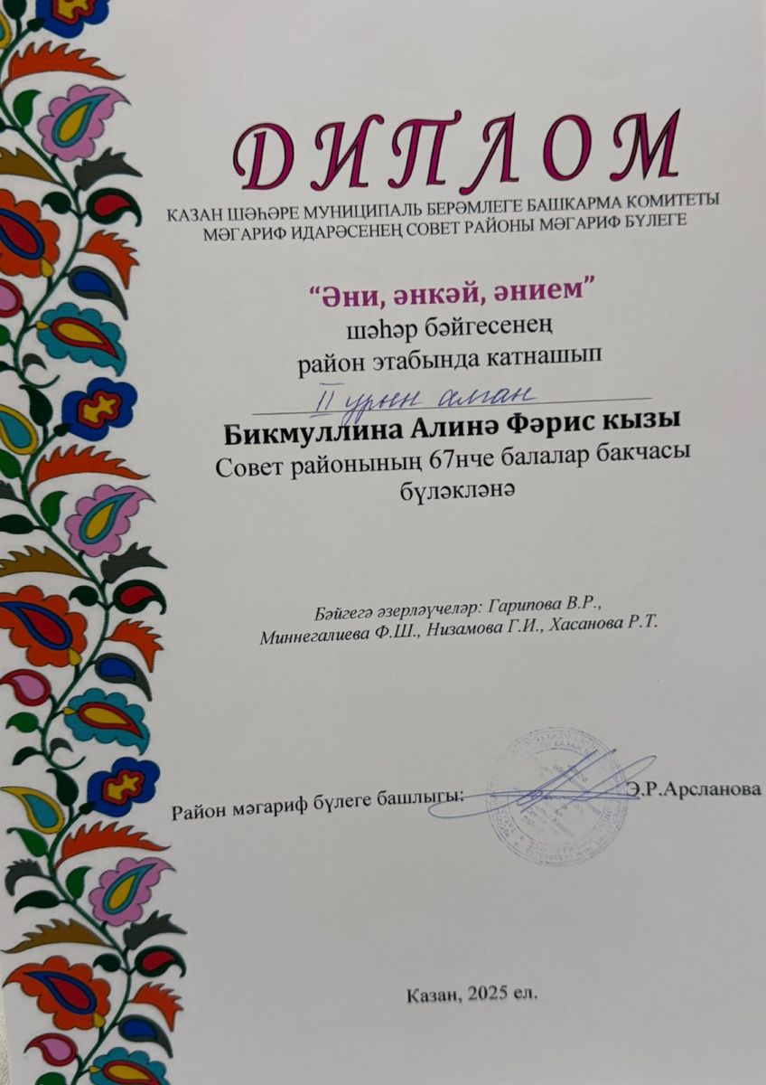 Поздравляем Бикмуллину Алину Фарисовну с 2 местом участия в районном этапе городского конкурса "Әни, әнкәй, әнием". Выражаем благодарность за активное участие в жизни детского сада.