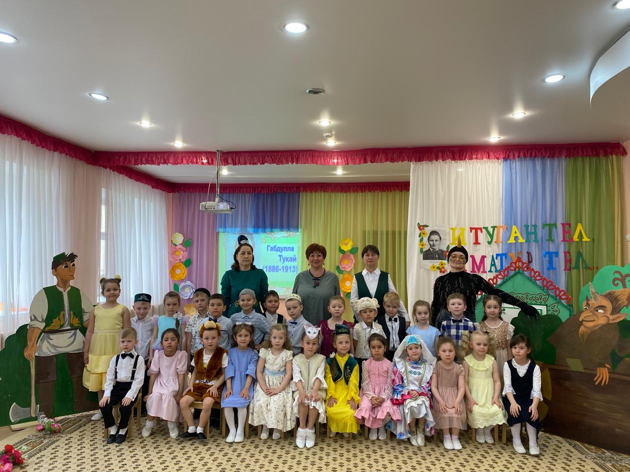 Бүген безнең балалар бакчасында бөек татар шагыйре Габдулла Тукайның туган көненә багышланган чара узды. Чарада педагоглар, мәктәпкәчә яшьтәге балалар катнашты. Балалар Габдулла Тукай әсәрләрен теләп укыдылар һәм сәхнәләштерделәр, җырлар башкардылар, уеннар уйнадылар, биеделәр. Балаларга кунакка әкият геройлары: Шүрәле, Су,кәҗә һәм сарык килде. Тукай китаплары туган якның матурлыгын, игелеген кадерләргә өйрәтә, мәрхәмәтле, гадел һәм кыю булырга өнди. Бәйрәм ахырында балалар татар халкының гимны булган "Туган тел" җырын башкардылар.Сегодня, в нашем детском саду прошло мероприятие, посвященное Дню рождения великого татарского поэта Габдуллы Тукая. В мероприятии участвовали педагоги, дети старшего дошкольного возраста. Дети с желанием читали и инсценировали произведения Габдуллы Тукая, исполняли песни, играли в игры, танцевали. В гости к ребятам пришли герои сказок: Шүрәле, Водяная,Коза и Баран. Книги Тукая учат ценить красоту родного края, доброте, призывают быть милосердным, справедливым и смелым. В завершении праздника дети исполнили песню "Туган тел", которая стала гимном татарского народа.