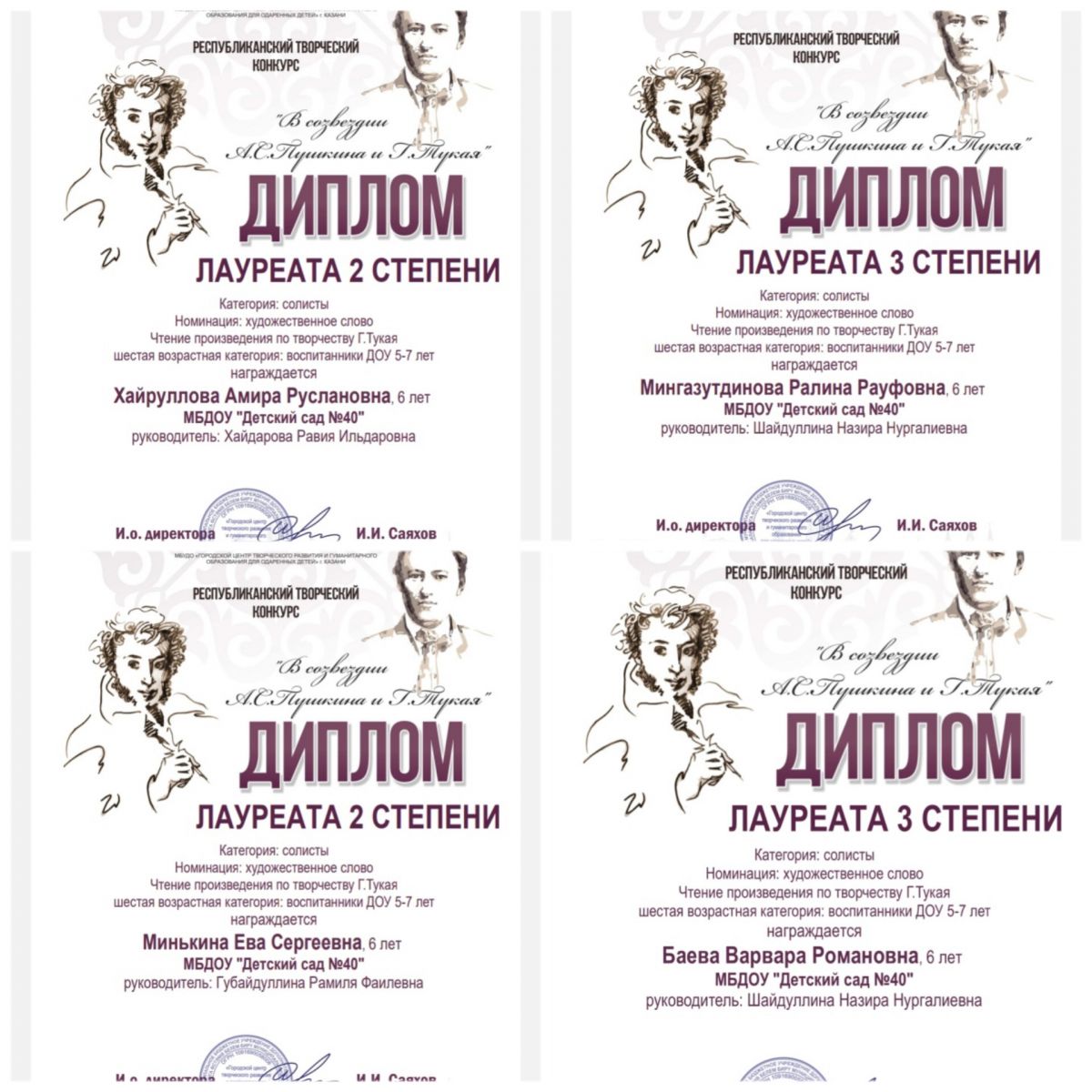 Безнең балалар бакчасында тәрбияләнүчеләр «А.С. Пушкин һәм Г. Тукай йолдызлыгында»-2024 республика иҗат бәйгесендә катнаштылар һәм призлы урыннар алдылар. Хәйруллова Әмирә-2 дәрәҗә диплом, Минькина Ева - 2 дәрәҗә диплом, Минһаҗетдинова Ралина - 3 дәрәҗә диплом, Баева Варвара - 2 дәрәҗә диплом. Котлыйбыз!!!!Наши воспитанники детского сада участовали в Республиканском творческом конкурес «В созвездии А.С.Пушкина и Г.Тукая»-2024 и заняли призовые места. Хайруллова Амира - диплом 2 степени, Минькина Ева- диплом 2степени, Мингазутдинова Ралина - диплом 3 степени, Баева Варвара - диплом 2 степени. Поздравляем!!!!