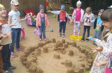 Сегодня в нашем детском саду состоялся конкурс построек из песка "Песочные фантазии". Воспитатели и ребята фантазировали на темы знакомых сказок, на тему моря. Дети с увлечением продемонстрировали, что из песка можно делать не только куличики, а построить целый город и придумать сказку о живущих в нем веселых и трудолюбивых жителях. А песочницу превратить в море , из которого вынырнул дельфин навстречу маленьким черепашкам.