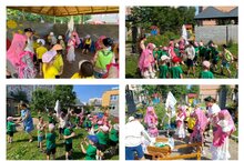 По старинной татарской национальной традиции с веселыми песнями, танцами и играми мы с детьми прошли по верандам детского сада, зазывали народ на праздник "Сабантуй". На главном символе – высоком шесте привязывали дары для победителей состязаний. С большим удовольствием к проведению мероприятия подключились и родители. Мероприятие прошло очень весело, все присутствующие остались довольны и получили огромный заряд положительных эмоций!