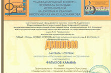 С убедительной победой на 6 международном конкурсе духовиков имени Ю.Н. Должикова, проходившего в Москве с 3 по 8 января 2017 года, вернулся ученик нашей школы Фатыхов Камиль (преподаватель Матвеева М.Э.). Камиль стал не только лауратом 1 степени, но также участвовал на торжественном гала-концерте. Фонд имени. В.Спивакова отметил выступление нашего ученика и пригласил его на фестиваль "Москва встречает друзей".