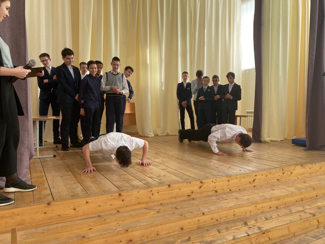Девочки поздравляли мальчиков стихами и частушками. Мальчики показывали силу, ловкость в упражнениях по отжиманию и прыжкам со скакалкой, а также свои знания в области военной науки, военной техники и военных терминов. Были конкурсы и среди болельщиков, которые за считанные секунды должны были отгадать загадки на военную тематику, а также продолжить пословицы и поговорки. С небольшим отрывом победу одержала команда мальчиков 7б класса. Членами жюри и ведущими турнира были учащиеся 10 класса.
