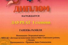 Поздравляем Гайнутдинову Камалию (преподаватель Шахмаметова Д.Ю.) с получением звания лауреата 1 и 2й степени сразу в четырех номинациях на Международной музыкальной премии "Sforzando"! Желаем дальнейших творческих успехов!