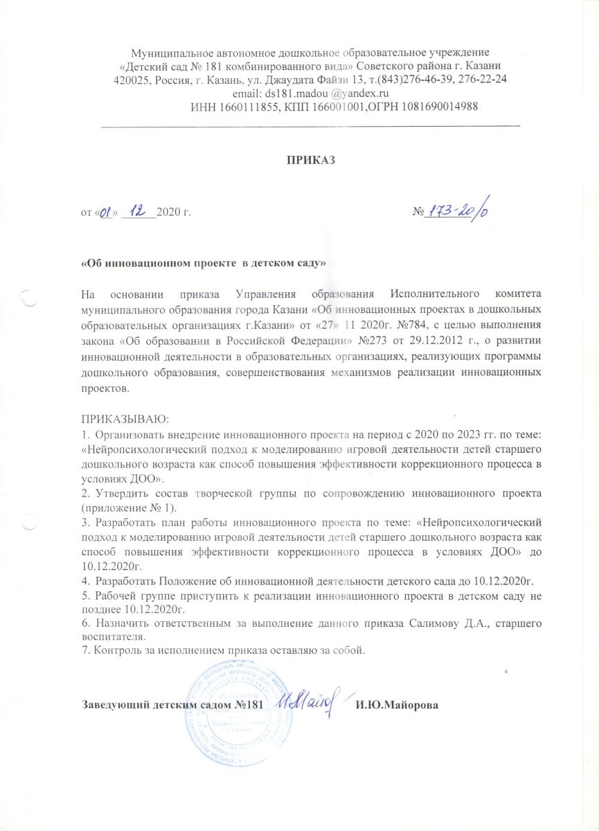 Приказ об инновационном проекте в детском саду