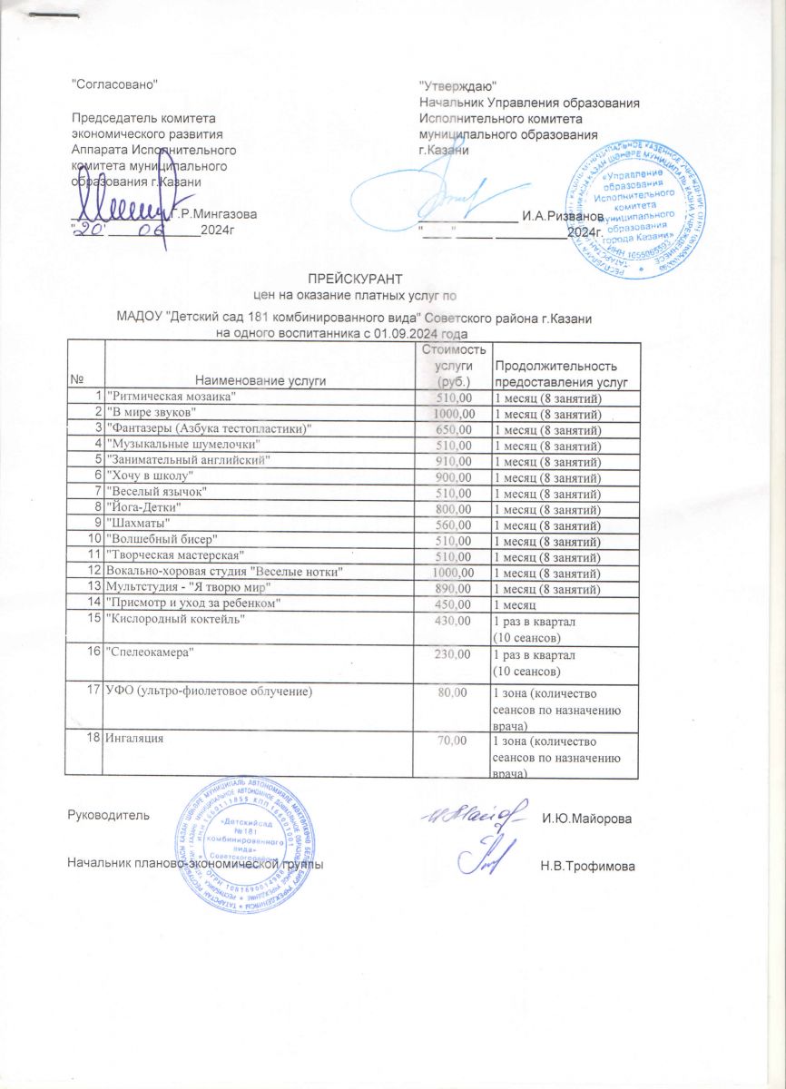 Прейскурант цен на оказание платных образовательных услуг на 2024-2025гг
