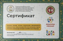 Казан шәһәре "Бала-сити" балалар бакчасында Татарстан Республикасы Рәисе каршындагы Татар телен һәм Татарстан Республикасында яшәүче халыклар вәкилләренең туган телләрен саклау, үстерү мәсәләләре комиссиясе тарафыннан оештырылган "Акыллы уеннар" өстәмә гомумүстерү программасын өйрәнү курслары булды. Татар теле тәрбиячебез Шәйдуллина Әдилә Вазиховна шушы курсларда белем өстәп кайтты. Бакчабыз мөдире һәм татар теле тәрбиячебез татар телендә 100 өстәл уеныннан торган комплект рәвешендәге методик пособие белән эшләү өчен сертификат белән бүләкләнде. Уеннар зәвыклы, балаларны кызыксындырырлык, сыйфатлы итеп эшләнелгән. Алга таба шушы проектны тормышка ашыру өстендә дә эшләячәкбез.