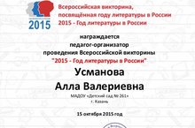 В соответствии с Указом Президента Российской Федерации от 12 июня 2014 г. № 426 в Российской Федерации 2015 год объявлен Годом литературы. Мы рады, что наши педагоги и воспитанники участвовали во Всероссийской викторине, посвященной 2015 году - Году литературы в России. Ребята ответили на интересные, увлекательные вопросы и стали призерами викторины. Викторина помогла нашим участникам расширить кругозор и проверить свои знания. Поздравляем воспитателя Усманову А.В. с достигнутыми результатами: Зинатуллин Карим – Iместо, Бариев Булат –IIместо, Газизова Лилия – IIместо, Айнуллин Мурат – IIIместо, Якимов Миша – IIIместо. -