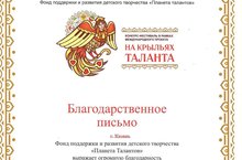 Воспитанница подготовительной к школе группы Илюхина М., выступила на конкурс- фестивале в рамках Международного проекта "На крыльях Таланта". Фонд поддержки и развития детского творчества "Планета Талантов" выражает огромную благодарность заведующей Сунгатуллиной Т.Г., музыкальному руководителю высшей квалификационной категории Зарифуллиной Ф.Р., за музыкально- эстетическое воспитание подрастающего поколения.