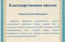 Сегодня творческий коллектив МАДОУ "Детский сад №399" награжден Благодарственным письмом Управления образования г.Казани за участие в гала- концерте городского фестиваля детского творчества "Балачак иле"!!!