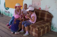 Девочки, как всегда, играют в свои игры, тем более, что на веранде не жарко, да и диван мягкий....