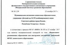 Нам выдали свидетельство о присвоении статуса экспериментальной площадки федерального гусударственного автономного учреждения "Федеральный институт развития образования". Тема экспериментальной площадки "Вариативно - развивающее образование как инструмент достижения требований ФГОС дошкольного образования".