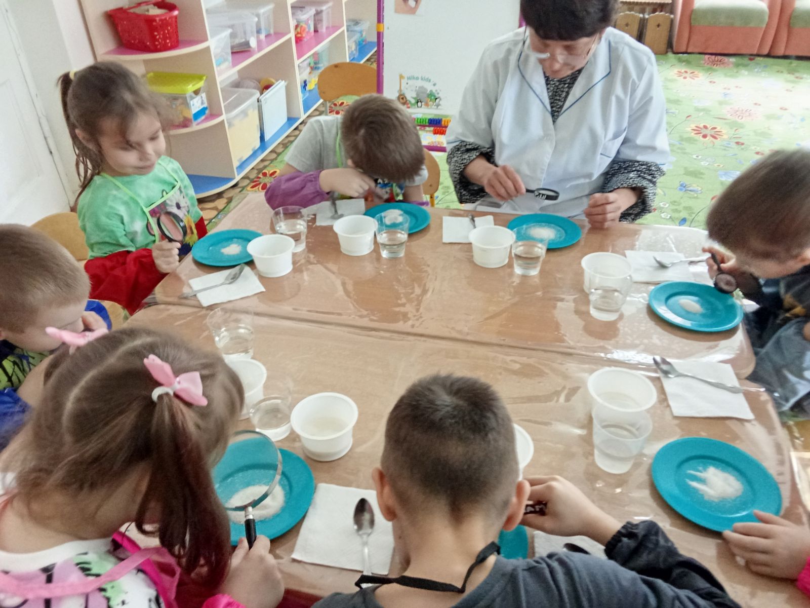 В ходе опытно – экспериментальной деятельности дошкольники познакомились со свойствами соли и сахара – хрустят, состоят из кристаллов, поглощают воду и растворяются в ней. А еще соль и сахар с помощью красок можно окрасить в разные цвета!