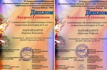 Поздравляем воспитанников детского сада Абдуллина Рафаэля и Павлову Елизавету с победой в IV Открытом Республиканском фестивале-конкурсе детских, юношеских, молодежных, творческих коллективов и исполнителей в рамках творческого проекта "Великая Победа - 2018», которые были награждены дипломами Лауреата 1 степени в номинации «Художественное слово». Спасибо большое воспитателю Хрустовой Светлане Алексеевне за хорошую подготовку. Дальнейших побед и успехов!!!